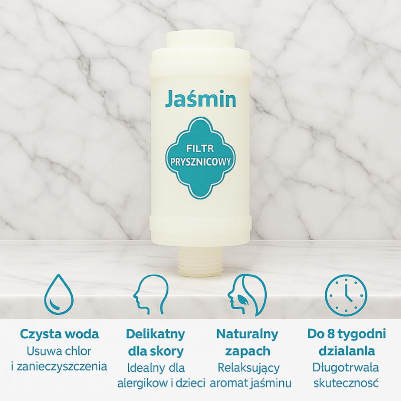 Oddychaj spokojnie i pielęgnuj swoją skórę już pod prysznicem. Filtr jaśminowy oczyszcza wodę z chloru i zanieczyszczeń, oferując delikatność, bezpieczeństwo i naturalny zapach. Idealny dla alergików, dzieci i każdego, kto ceni codzienny komfort w łazience.